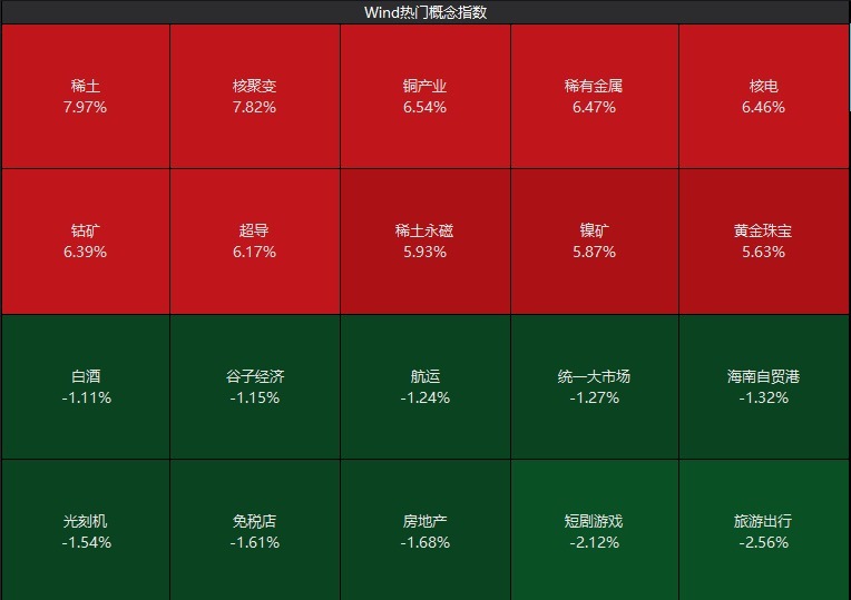 Wind数据显示,板块题材方面,稀土板块领涨,涨幅接近8%,核聚变板块涨7.82%,铜产业、稀有金属、核电、钴矿、超导等板块涨超6%。旅游出行、短剧游戏、房地产、免税店、光刻机等板块跌幅居前。