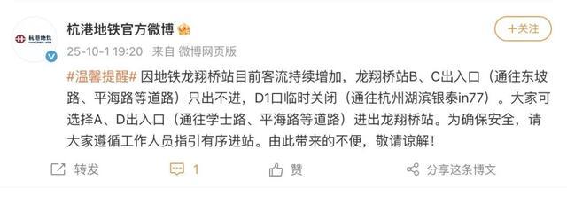 杭州地铁发布最新通知:因地铁龙翔桥站目前客流持续增加,龙翔桥站B、C出入口(通往东坡路、平海路等道路)只出不进,D1口临时关闭(通往杭州湖滨银泰in77)。大家可选择A、D出入口(通往学士路、平海路等道路)进出龙翔桥站。为确保安全,请大家遵循工作人员指引有序进站。由此带来的不便,敬请谅解!